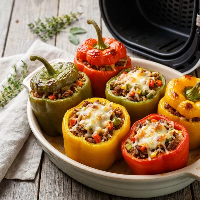 Stuffed bell peppers are one of the oldest comfort food ideas in the book. Every family has a version, every cook has their preference for the color of the pepper or the type of cheese on top. This recipe doesn’t try to reinvent anything — it just takes a dish that’s always been worth making and removes the part where it takes all evening. The air fryer handles that. You just handle the filling.